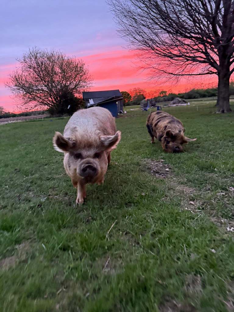 You couldn’t see my face, the blanket completely covered my body. The day was coming to an end and all day long I struggled. Until I pulled back the covered and looked outside and realized the sunset was stunning and I ran outside. I ran to Gods painting of the day and ran to a place that always brings joy, the pigs. This is the picture I got, followed by being sandwiched between both of them. Finally, I heard laughter, I felt joy.
